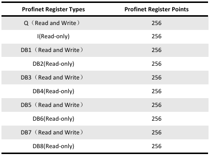 The S7 gateway supports the Siemens S7 standard protocol. The register types and the maximum number of points supported by this gateway are as shown in the table below. Note: The number of gateway register points is dynamically supported. The total number of points cannot exceed 256