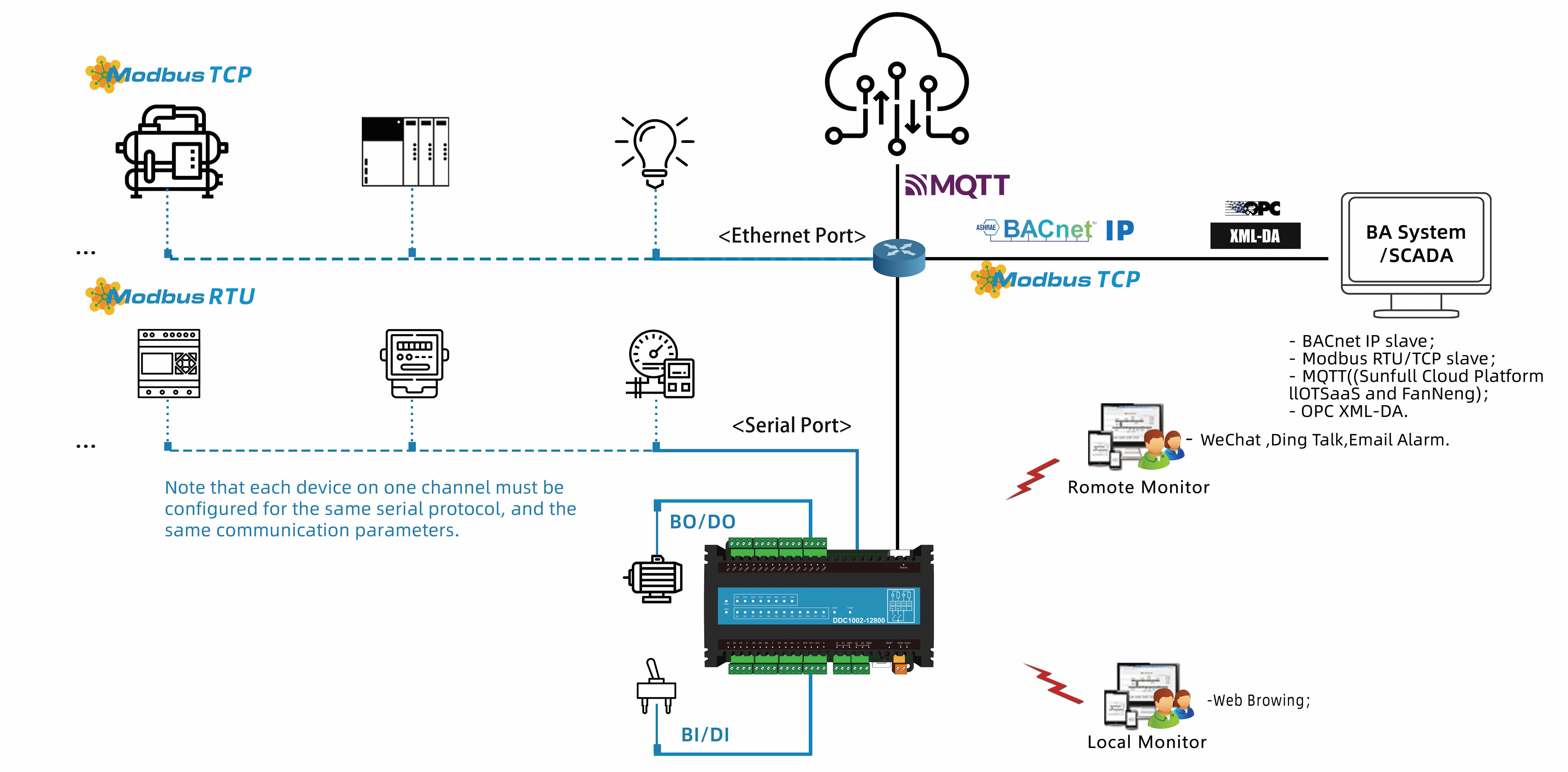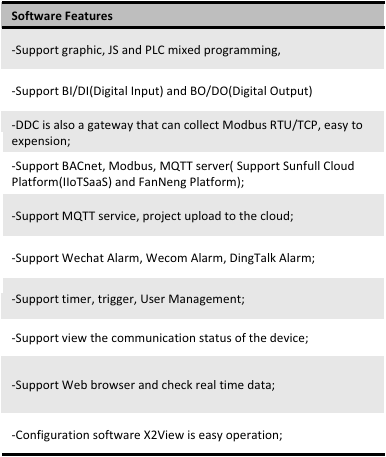 DDC1002-12800 (1 Ethernet, 2 serial port, 12 DI, 8 DO, dynamically supports 512 points) only supports collecting Modbus RTU/TCP and Simulator driver, and convert it to BACnet IP and Modbus TCP servers simultaneously. Using X2View software to make the project(can¡¯t make configuration pages). User can configure the project according to the communication protocol document of on-site Modbus RTU/TCP device , and convert it to a standard BACnet IP and Modbus TCP server. After monitoring successfully on the local monitor mode, upload the project file to DDC module to access the data of on-site device (Note: The decimal address of the collection end starts from 1 (Base1), and the hexadecimal address starts from 0 (Base0); The Modbus register base address of the transfer end starts from 1 (Base1).