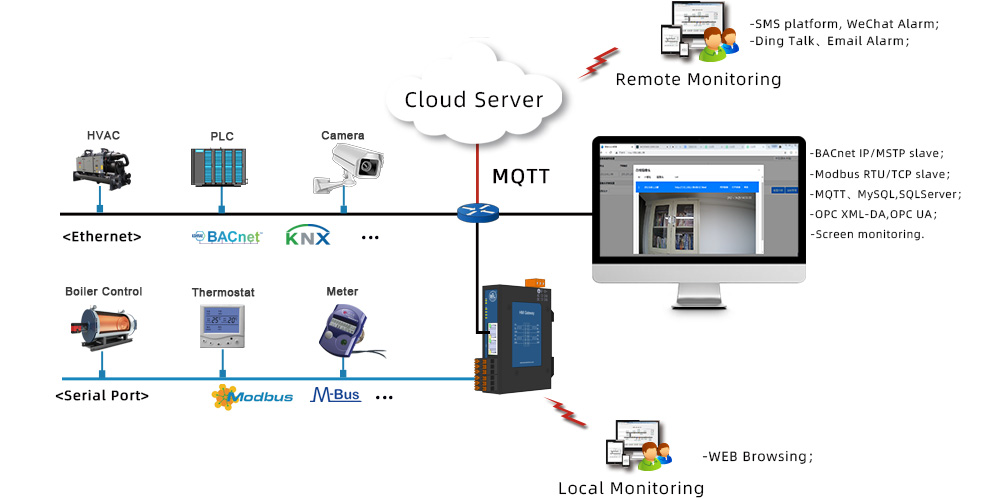 - Support transfer to BACnet server 、Modbus server 、OPC XML-DA、 OPC UA server、MQTT server;