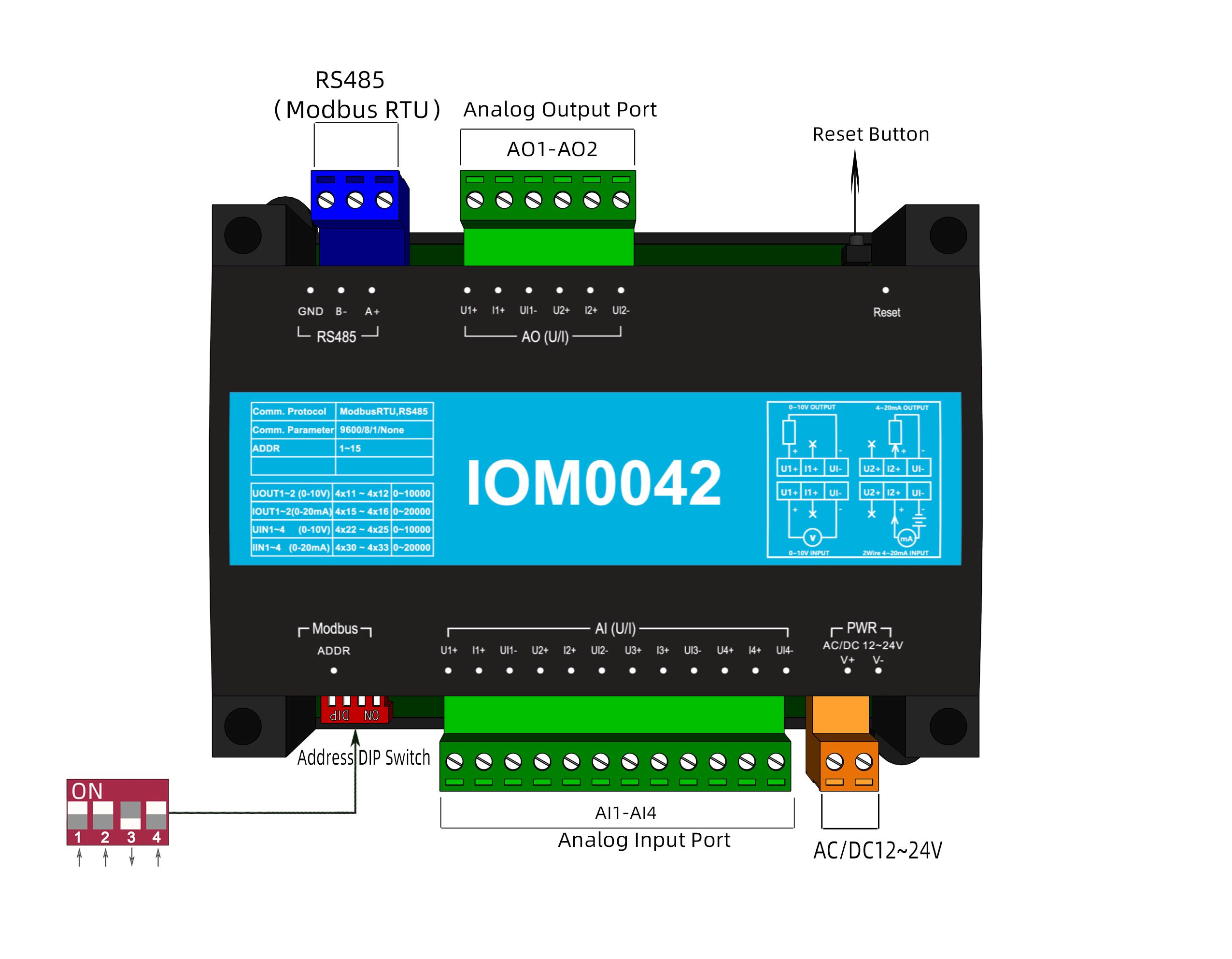 Q④: How to forcibly reset the baud rate of this I/O module to its default value? A④ : Activate the module's hardware reset button (typically labeled Reset). This action immediately restores the baud rate to 9600, ensuring rapid reset of the communication link to its initial state.