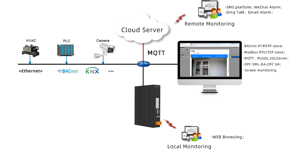 - Support transfer to BACnet server 、Modbus server 、OPC XML-DA、 OPC UA server、MQTT server;