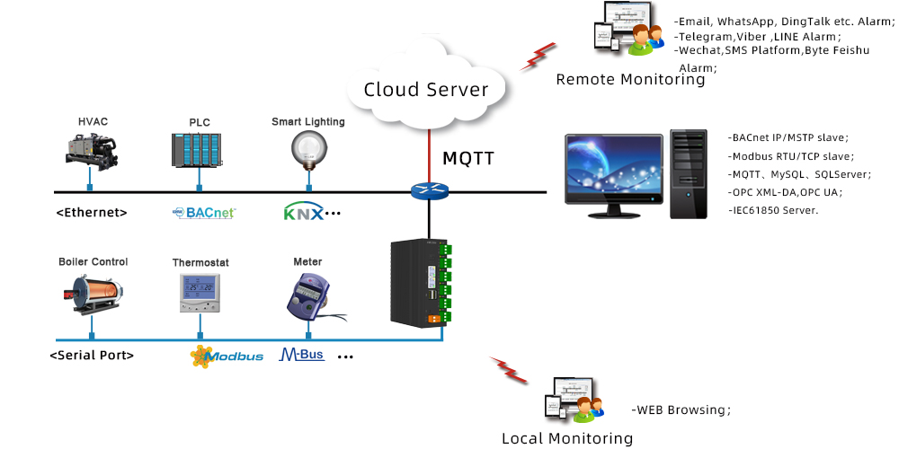 The IoT gateway HMI2006-A55 (with 2 Ethernet port, 6 RS485 serial ports, and dynamic support for 2048 points) is capable of collecting data from Modbus RTU/TCP and more than 500 protocols, and simultaneously forwarding it to Modbus, BACnet, OPC UA, MQTT and IEC61850 server. It also features WeChat, SMS platform, DingTalk, Email, FeiShu, WhatsApp, Telegram, Viber, and LINE Alarm, and the ability to upload engineering projects to the cloud.