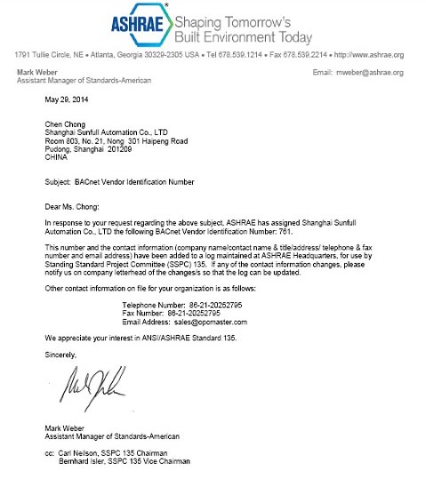 ASHRAE has assigned Shanghai Sunfull Automation Co., LTD the following BACnet Vendor Identification Number: 761.