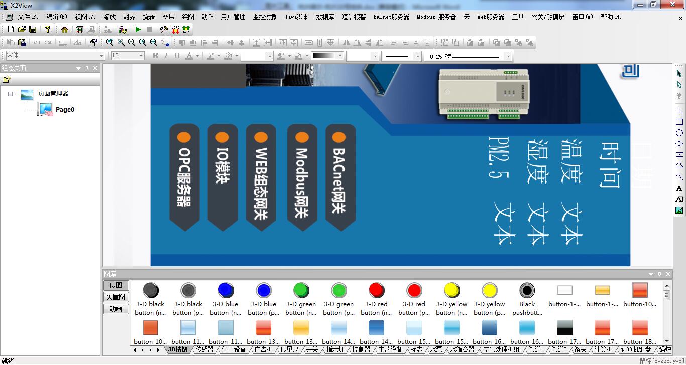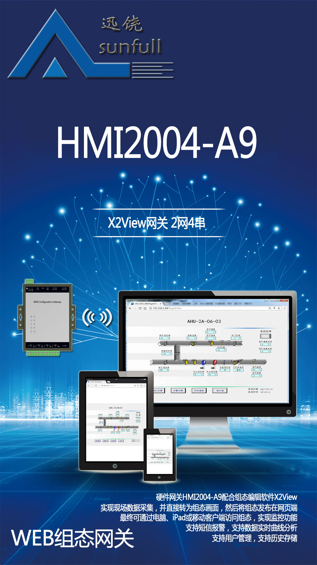 硬件网关HMI2004-A9配合组态编辑软件X2View可实现现场数据采集,并直接转为组态画面进行数据实时监控。用户无需购买组态软件,只需用电脑、手机、IPAD或自带浏览器功能的设备即可登录组态画面进行监控,实现远程监控设备启停、运行等操作,给用户带来良好的操作体验。 X2View是上海迅饶自主研发新一代的基于HTML5规范的组态软件。具有常规通用组态操作方便的特性,另外有具有触摸屏组态软件可以运行在嵌入式系统上的特性。比起其它组态软件,最大的亮点是完全基于WEB开发,用户创建的组态工程,可以下载到硬件上运行。智能手机、iPad或者PC可以通过浏览器访问,特别适合应用在BA、智能家居等场合。 3.方案设计 3.1方案介绍 组态网关采集温湿度传感器数据,并编辑成组态页面,实现产品图片的轮播和数据的实时更新。