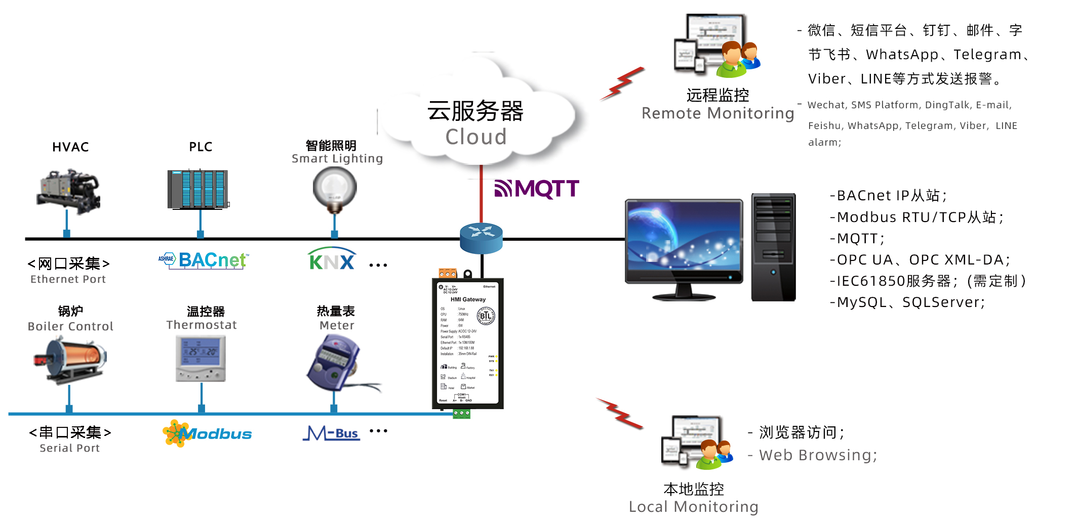 WEB组态网关HMI1001-ARM配合组态编辑软件X2View可实现现场数据采集,并直接转为组态画面进行数据实时监控。用户无需购买组态软件,只需用电脑、手机、IPAD或自带浏览器功能的设备即可登录组态画面进行监控,实现远程监控设备启停、运行等操作,给用户带来良好的操作体验。同时具微信报警、短信平台报警、钉钉报警、邮件报警、MQTT服务、工程上传云端等功能;还可以转发为BACnet服务器、Modbus服务器、OPC UA服务器、MQTT服务器、IEC61850服务器(需定制),开放HTTP WEB服务被第三方的系统集成。