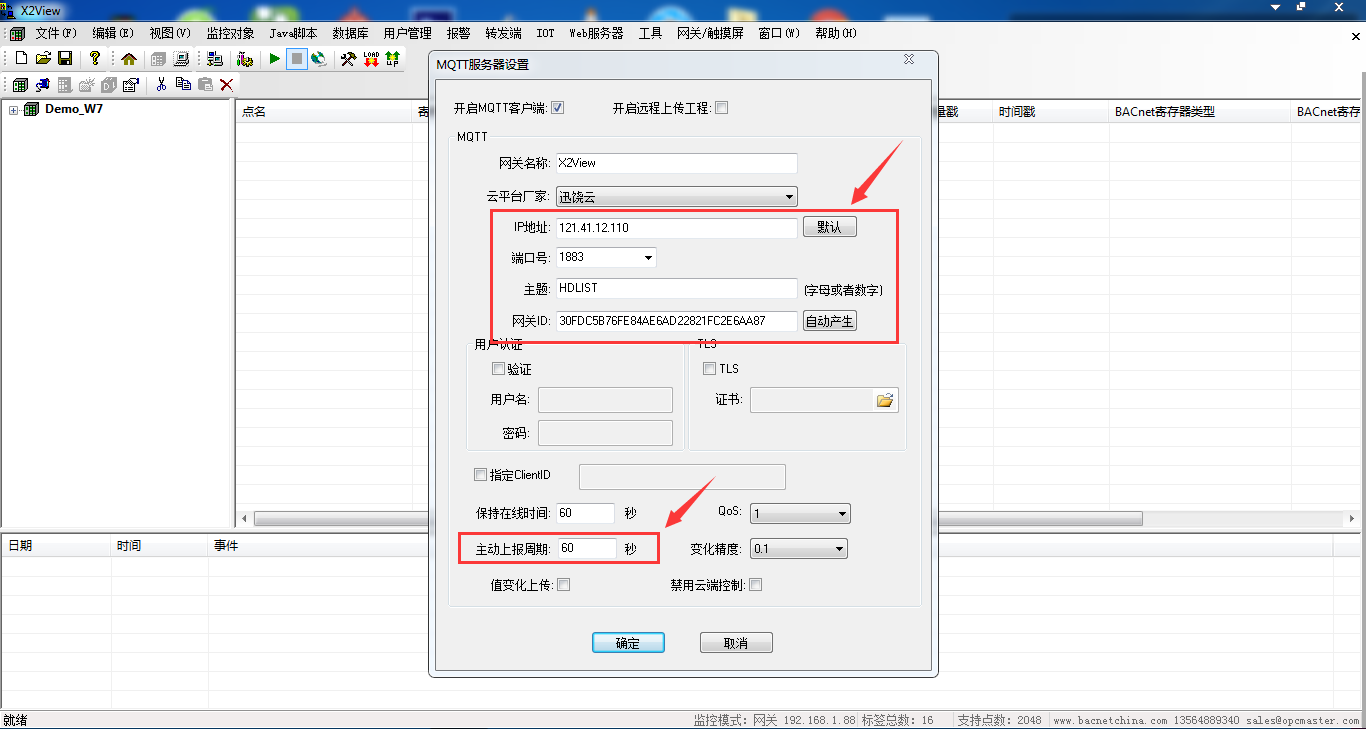 网关配置软件中选择设备对应的协议接口,如BACnetIP、ModbusRTU、ModbusTCP;然后配置设备通讯参数,如IP地址或波特率、停止位,最后项目现场设备通讯,通讯稳定后,设置MQTT客户端推送数据; 注意:后期如果有其他设备要接入,可以修改在原工程上修改配置; 说明:“网关名称”可根据情况自定义,“主题”是软件需要连接网关IOT中主题; “网关ID”是IOT中产生的ID: