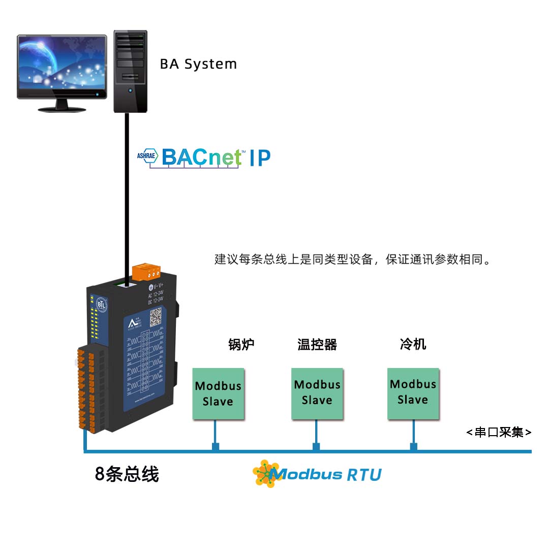 解决江森的Metasys、霍尼的EBI或Niagara、西门子的Insight或Desigo CC、施耐德的EBO等楼控组态软件集成Modbus RTU设备的问题,如支持Modbus RTU协议的PLC、DDC、温控器、电梯、空调、UPS、消防、智能照明、电表、水表等各种设备。